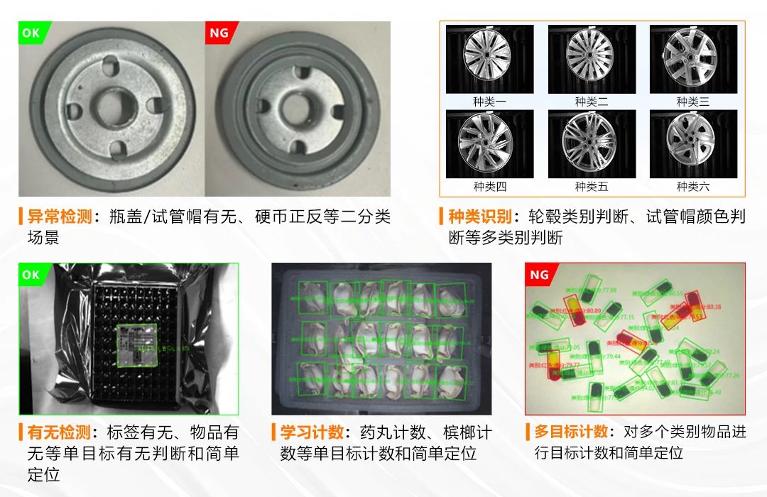 邊緣學(xué)習(xí)算法作為深度學(xué)習(xí)的一種,對樣品輕微形變、背景噪聲、環(huán)境光干擾等傳統(tǒng)算法難以處理的復(fù)雜工況展現(xiàn)出更強適應(yīng)能力。邊緣學(xué)習(xí)僅需1-5張樣圖即可完成模型迭代,小樣本學(xué)習(xí)優(yōu)勢與智能相機的便捷特性形成深度協(xié)同,助力項目快速落地與批量復(fù)制。